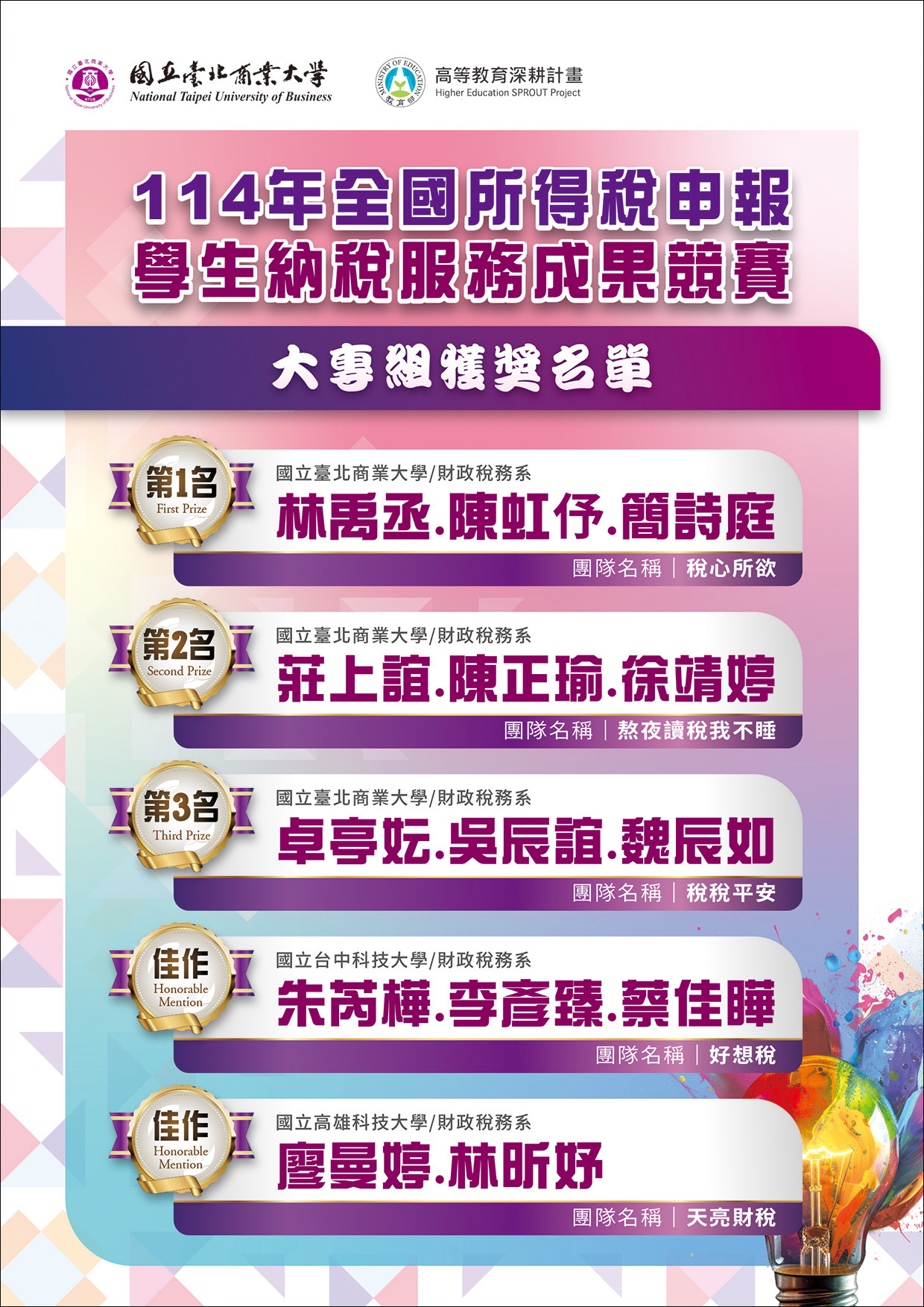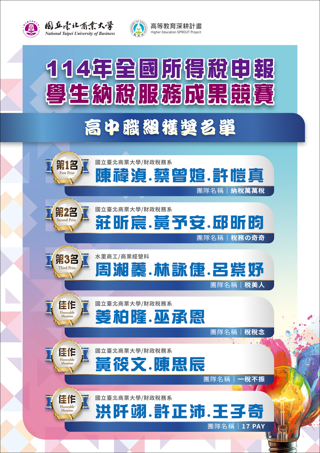 【競賽】得獎公告~114年全國所得稅申報學生納稅服務成果競賽